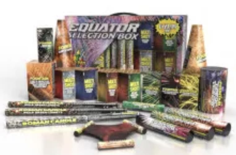 Medium-sized selection box, ideal for smaller displays. Has a variety of fireworks including multi shots, Roman candles, and fountains.