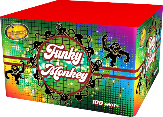 The wild barrage that will make you go bananas! 100 loopy shots of silver spinners blasting into red & green peonies, red & silver wave comets bursting into red & silver coconuts, gold mines ejecting banana yellow comets into banana yellow peonies, gold mines leading to blue pearled brocade crowns, dizzy spinning comets bursting into red & green peonies, crazy spinning whistling comets bursting in red, green & blue peonies with crackle and a finale of crackling mines ejecting whistling comets exploding into crackling brocades.