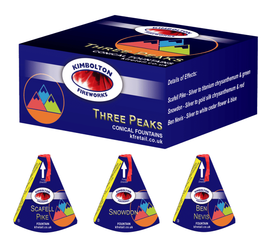 Each pack contains three 4'' silver conical fountains, featuring dazzling effects: a titanium chrysanthemum with green, a gold silk chrysanthemum with red, and a white cedar flower with blue, creating a vibrant and varied display.