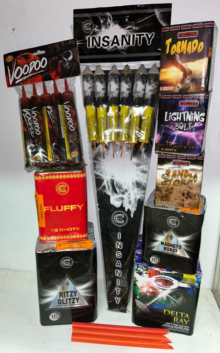 - Delta Ray - Fluffy - Insanity - 3 x Storm Chaser - Magneto Burst OR Storm OR Flash Harry - Ritzy Glitzy - Voodoo Roman Candle Pack of 5