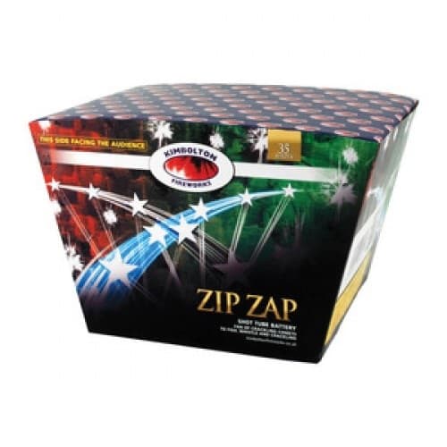 35 alternating fan shots. Including red and green tipped crackling comets, red tail to silver fish, silver whistle, crackling mines finale.