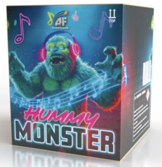 A unique 25-shot, 20mm firework. The Hummy Monster features mesmerising multicoloured hummers for a vibrant, low-noise display — perfect for garden parties and quieter celebrations.